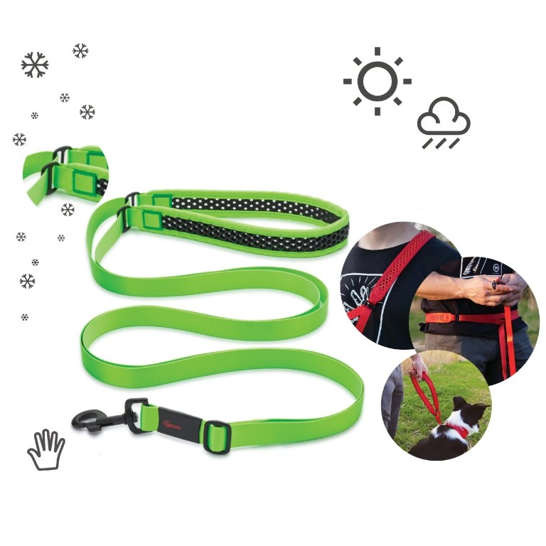 Das flexible Tragesystem ermöglicht die Nutzung in der Hand, als Bauchgurt- oder als Schulterleine. Der Schaumstoffgriff sorgt dabei für Komfort, auch bei stark ziehenden Hunden.